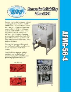 Biro AFMG-56-4 Auto-Feed Mixer-Grinder. Increase your production output without spending a fortune. The Biro Model AFMG-56-4 Auto Feed Mixer-Grinder has a 400 lbs. (182 kg) product hopper capacity. The 15 HP (11.2 kW) auger motor & 5 HP (3.7 kW) mixer motor are powerful enough so they won’t bog down.