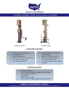 AMFEC 2-3K-2 Column Loader. Portable base frames. Extra tall units available (capable of 14’ discharge). Custom discharge chutes. Side loading. Roller bed lift carriage. Severe duty units also available for bakery industry.