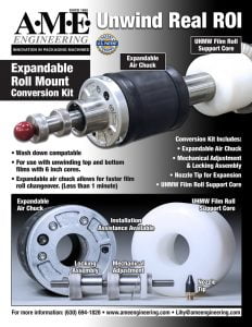 AME Engineering Expandable Roll Mount Conversion Kit Unwind Real ROI. Wash down compatable. For use with unwinding top and bottom films with 6 inch cores. Expandable air chuck allows for faster film roll changeover. (Less than 1 minute)