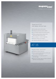 Supervac AT 15 Hot Water Shrink Tank. All stainless steel construction. Heating by electricity and/or steam. Touch Screen Control Unit (menu-driven). Fully insulated - minimum heat loss.