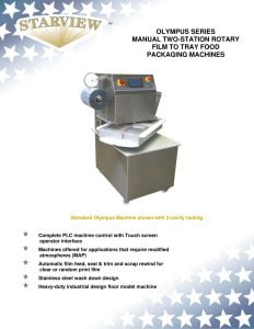 Starview Olympus Series Packaging Machine. Complete PLC machine control with touch screen operator interface. Machines offered for applications that require modified atmospheres (MAP).