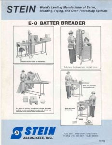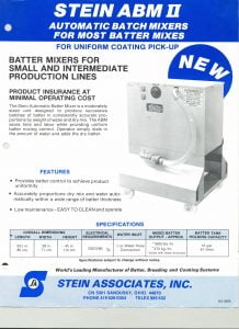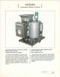 Stein Automatic Batch Mixer. Provides batter control to achieve product uniformity. Accurately proportions dry mix and water automatically within a wide range of batter thickness.
