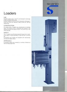 Scanio Loaders Series. SCANIO loaders type L7 and K7 are intended for discharge of 220 l standard meat trucks. SCANIO loaders K12 and K16 are intended for discharge of trucks and vats with maximum loads of 600 and 1000 kg respectively.