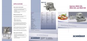 Schroder Imax 430/630/920 Injectors. Whole chickens, half chickens and pieces such as drum sticks, breasts, and wings. Integration in all standard cut-up lines. Adjustment to the capacity of cut-up lines.