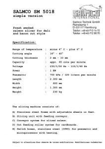 Salmco SM 5018 Slicer. Stainless steel frame with adjustable wheels or feet. Slicing unit with feeding conveyor. Conveyor system for sliced salmon. Out feeding roller system for cardboards.