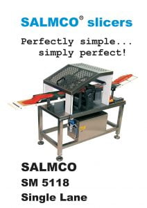 Salmco SM 5118 Single Lane Slicer. Complete stainless steel frame with adjustable feet. Slicing unit with feeding conveyor. Conveyor system for sliced salmon. Out feeding roller system for cardboards.