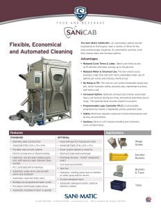 Sani-Matic SaniCab Washer. The Sani-Matic SANiCAB is an automated cabinet washer engineered to thoroughly clean a variety of items for the food and beverage industries.
