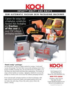 Koch Intact RM571/RM572 Semi-Automatic Vacuum Skin Packaging Machine. Intact semi-automatic packaging machines are ideal for packaging a wide range of fresh or frozen meat, poultry and seafood products such as rib-eye steaks, loin pork chops, t-bones, fish, sushi, oysters, lobster tail, salmon or shrimp.
