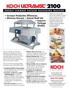 Koch Ultravac 2100 Double Chamber Vacuum Packaging Machine. Whether it’s meat, poultry, cheese, fish, seafood, or produce that you need to preserve, the Ultravac 2100 is the most dependable, simple to own, simple to operate, double chamber vacuum packaging machine available in the marketplace.
