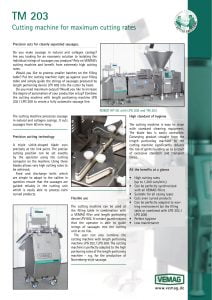 Vemag TM 203 Cutting Machine. Conveying product straight from the length portioning machine to the cutting machine significantly reduces the risk of germs building up as a result of excessive standstill and transport times.