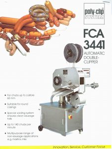 Poly-Clip FCA 3441 Automatic Double-Clipper. For chubs up to calibre 65 mm. Suitable for round casings. Special voiding system ensures clean sausage tails. Up to 140 chubs per minute.