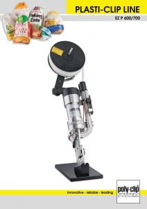 Poly-Clip EZ P 600/700 Plasti-Clip Line. Patented clip shape for control. Tight uniform closure every time. Machine fits to existing bagger. Portable table-mounted unit. Fast and smooth operation.