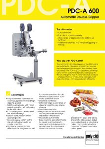 Poly-Clip PDC-A 600 Automatic Double-Clipper. Fully automated operation for continuous production and high clipping speeds. Safety casing brake with handguard; operation without casing brake is blocked.