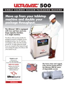 Ultravac 500 Single Chamber Vacuum Packaging Machine. The Ultravac 500 more than doubles the packaging production of tabletop vacuum packaging machines. Two 18” seal bars, one located on either side of the chamber, provide 36” of usable sealing bar length.