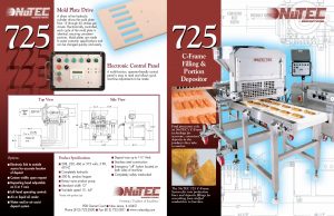 Nutec 725 C-Frame Filling And Portion Depositor. A direct in-line hydraulic cylinder drives the mold plate from 15 through 65 strokes per minute. Electronically controlled, each cycle of the mold plate is identical, ensuring consistent portions.