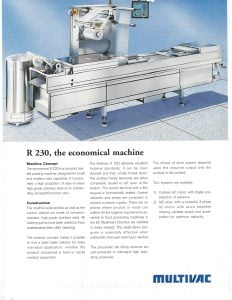 Multivac R 230 Thermoforming Machine. The economical R 230 is a compact reel-fed packing machine, designed for small and medium-size capacities. It incorporates a high proportion of easy-to-clean high-grade stainless steel at an outstanding price/performance ratio.