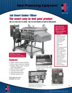 MTC Smart Cooker/Mixer. Indirect steam-jacket heating. Direct steam injection heating. Paddle, ribbon (with scrapers) and solid agitators. Self-contained controls. Culinary steam filter. Dual discharge doors.