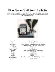 Mince Master GL-86 Bench Emulsifier. GL-86 Emulsifier, 5hp motor, 3600 RPM motor, 220V/3PH/60HZ, 86mm diameter single plate, hole sizes range 1.4mm to 4.0mm, output of 30-45 pounds/min. of emulsion, 50-pound capacity hopper, Includes plate, knife, manual and tools.