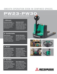 Mitsubishi PW23-PW30 Electric Walkie. Designed with an Alternating Current (AC) drive system, these walkies offer precise speed control, smooth directional changes and quiet operation.