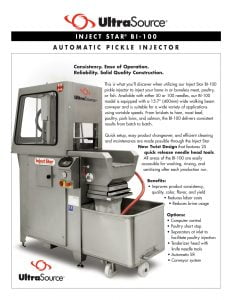 UltraSource Inject Star BI-183 Pickle Injector With Cooling. From briskets to ham, roast beef, poultry, pork loins, and salmon, our BI-183 delivers consistent results through the use of its menu guided ISC-E40 touch screen computer control system.