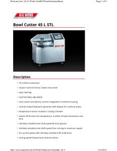 K&G Wetter 45L STL Bowl Cutter. CE-conform execution. Massive machine frame, lowest noise level. Main switch and electric control integrated in machine housing. Temperature sensor located in cutting chamber.
