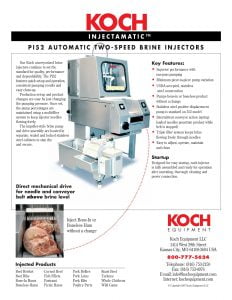 Koch PI52 Automatic Two-Speed Brine Injector. Superior performance with one-pass pumping. Minimum piece-to-piece pump variation. Pumps bone-in or boneless product without a change.