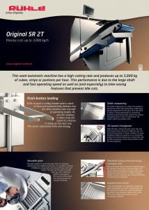Ruhle Original SR 2T Cutter. This semi-automatic machine has a high cutting rate and produces up to 3,000 kg of cubes, strips or portions per hour. This performance is due to the large shaft and fast operating speed as well as (and especially) to time-saving features that prevent idle cuts.