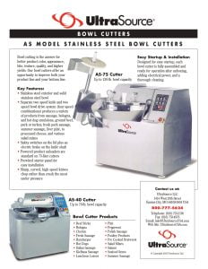 UltraSource AS-40/AS-75 Bowl Cutters. Separate two-speed knife and two-speed bowl drive system (four-speed combinations) produces a variety of products from sausage, bologna, and hot dog emulsions, ground beef, pork or turkey, fresh pork sausage, summer sausage, liver paté, to processed cheese, and various salad mixes.