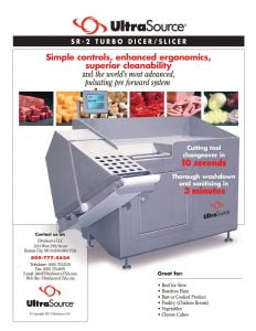 UltraSource SR-2 Turbo Dicer/Slicer. Serrated knives. Angle shaft. Computer panel. Mechanical pressure system. Lift for product containers. Pressure-sensitive pre-compacting. Multiplex grid on roller bearings.