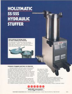 Hollymatic 55/55S Hydraulic Stuffer. Sausage making is efficient and economical with the new Hollymatic Hydraulic Stuffer. Completely portable, the Hollymatic Model 55/55S can be wheeled to the production area easily on large heavy-duty casters.
