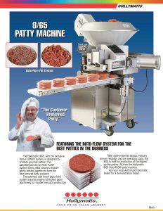 Hollymatic 8/65 Patty Machine. The Hollymatic 8/65, with the exclusive Roto-FLOW fill system, is designed to produce gourmet patties! The patented, side notch paper feed system assures positive controlled paper positioning for trouble free patty production.