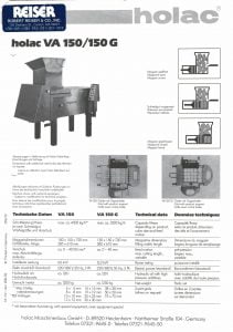 Holac VA 150/150G Dicer. Capacity depending on product, cube size and feed motion. Electric power. Hydraulic oil with pressure additives.
