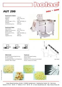 Holac AUT 200 Dicer. Fully automated feeding. High output. Blocks or off-cuts can be processed. Dice, Julienne-cut, Shred.
