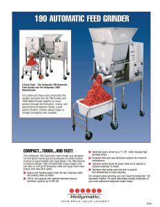 Hollymatic 190 Automatic Feed Grinder. Special self-feeding augers clear the tub, reducing waste and making clean-up faster. 100 lb. tub capacity with optional extension feature increases capacity up to 200 lbs.