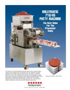 Hollymatic 710/45 Patty Machine. This machine is specially designed for the smaller sized processor who wants the ability to produce the exclusive "Cut Flow" Patty.