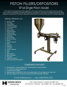 Hinds-Bock SP-64 Single Piston Fillers/Depositors. The Hinds-Bock standard-piston filler/depositor is the classic workhorse of the food processing industry. Large port openings permit filling of large particulates without crushing.