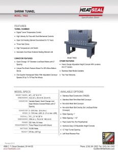 Heat Seal T4822 Shrink Tunnel. Digital tunnel temperature control. High velocity airflow with dual mechanical controls. Automatic cool down extends heating element life. High temperature limit switch.