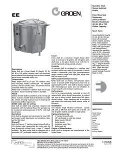 Groen EE Series Steam Jacketed Kettle. Kettle shall be a Groen Model EE (Specify 20, 40, 60, 80 or 100 gallons) stainless steel, self-contained, steam jacketed unit operating from an electric heated steam source contained within unit.