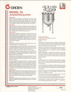 Groen TA Jacketed Mixing Kettle. Model TA meets the challenges of processing many hard-to-handle products, including cheese products, sausage, taco meat, refried beans, caramel, cream centers, bakery fillings, and ice cream base.