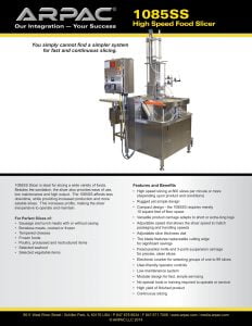 Arpac 1085SS High Speed Food Slicer. 1085SS Slicer is ideal for slicing a wide variety of foods. Besides the sanitation, the slicer also provides ease of use, low maintenance and high output.