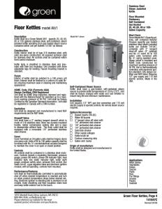 Groen AH/1 Floor Kettles. Kettle body is sheathed in stainless steel and insulated with fiber bat insulation. Unit provided with three adjustable legs for leveling. Faucet mounting bracket is standard.