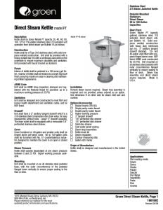 Groen PT Series Direct Steam Kettle. Interior of kettle shall be polished to a 180 emery grit finish. Exterior of kettle shall be finished to a bright high buff finish, ensuring maximum ease in cleaning and maintaining a brilliant appearance.